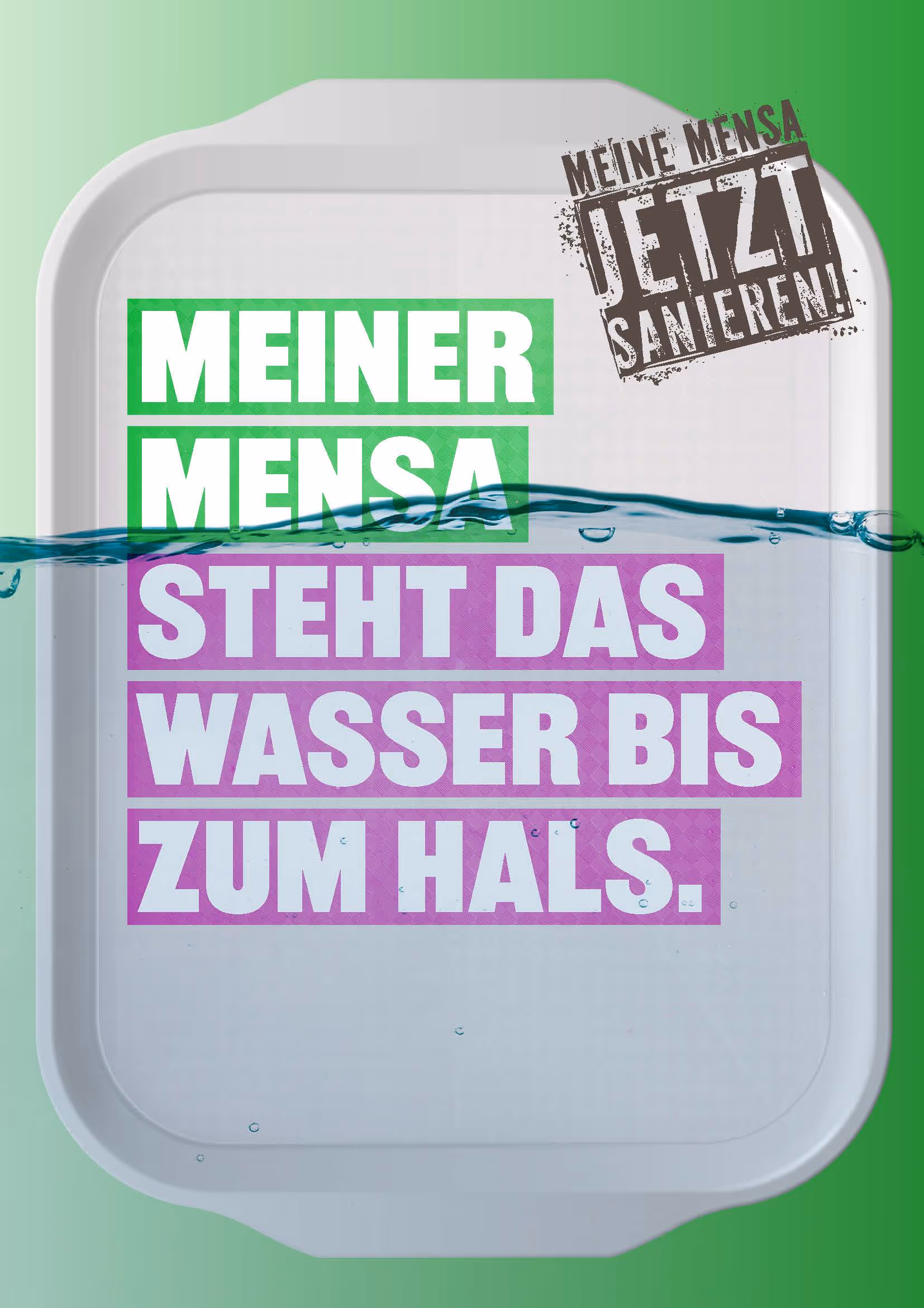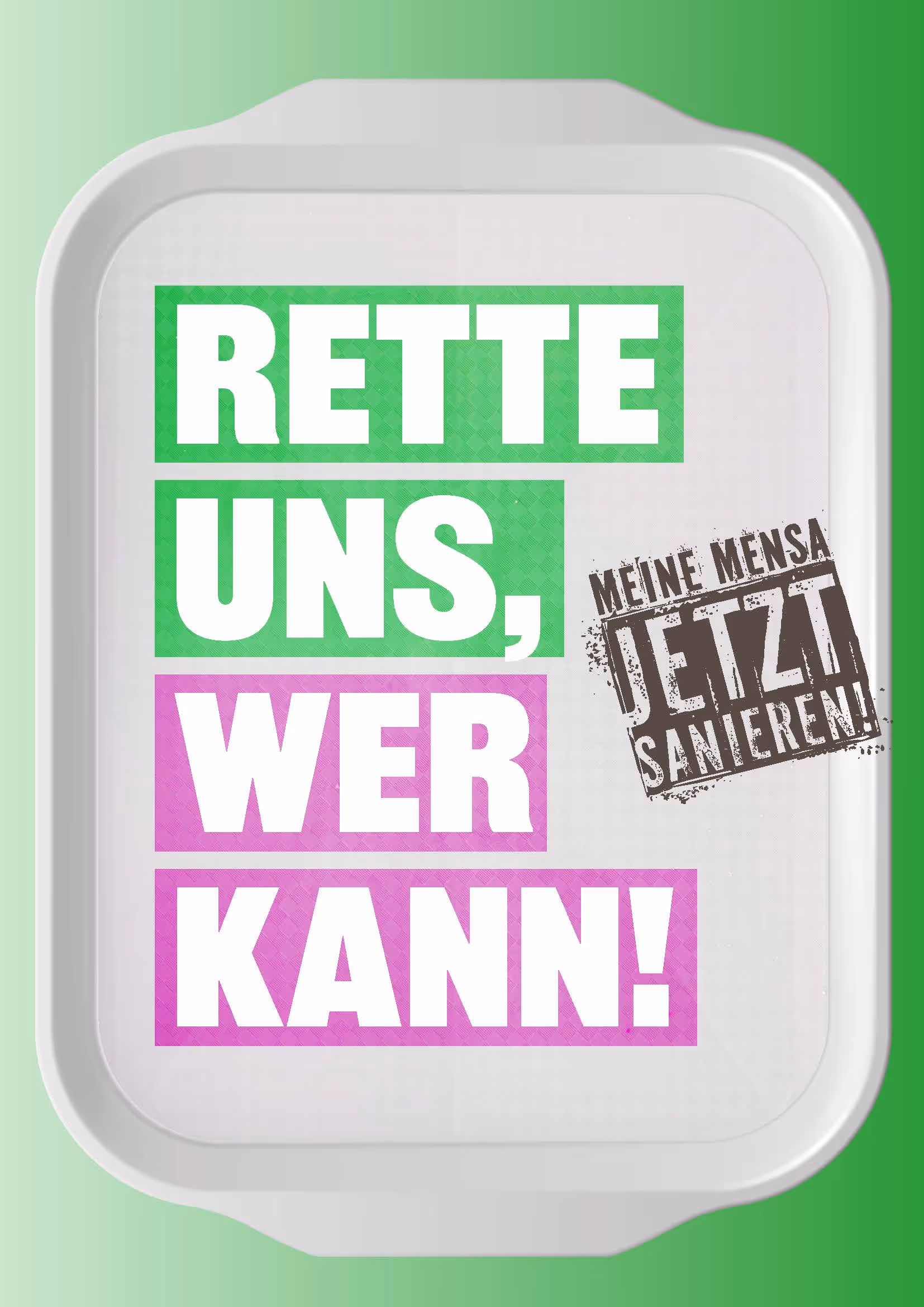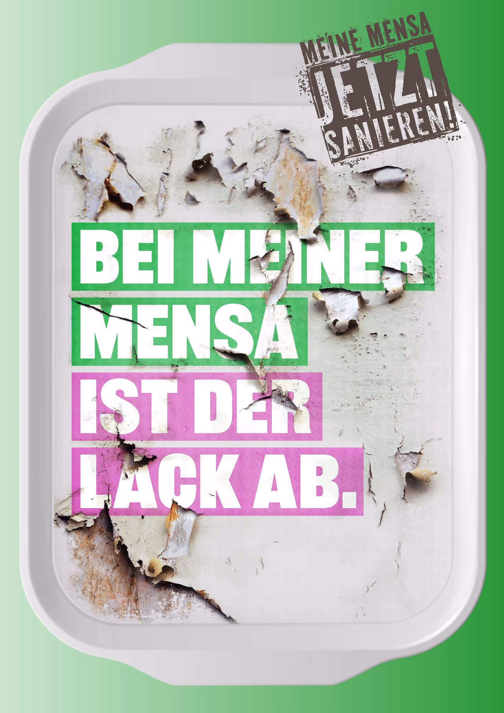 Das allseits bekannte Mensatablett wird zum Keyvisual. Die Missstände werden im modernen Design auf dem Tablett serviert. „Meiner Mensa steht das Wasser bis zum Hals“, „Meine Mensapfeift aus dem letzten Loch“ - die Hilferufe sind fröhlich bunt und fürchterlich eindringlich. Über allem der Appell Richtung Politik: „Rette uns, wer kann!“