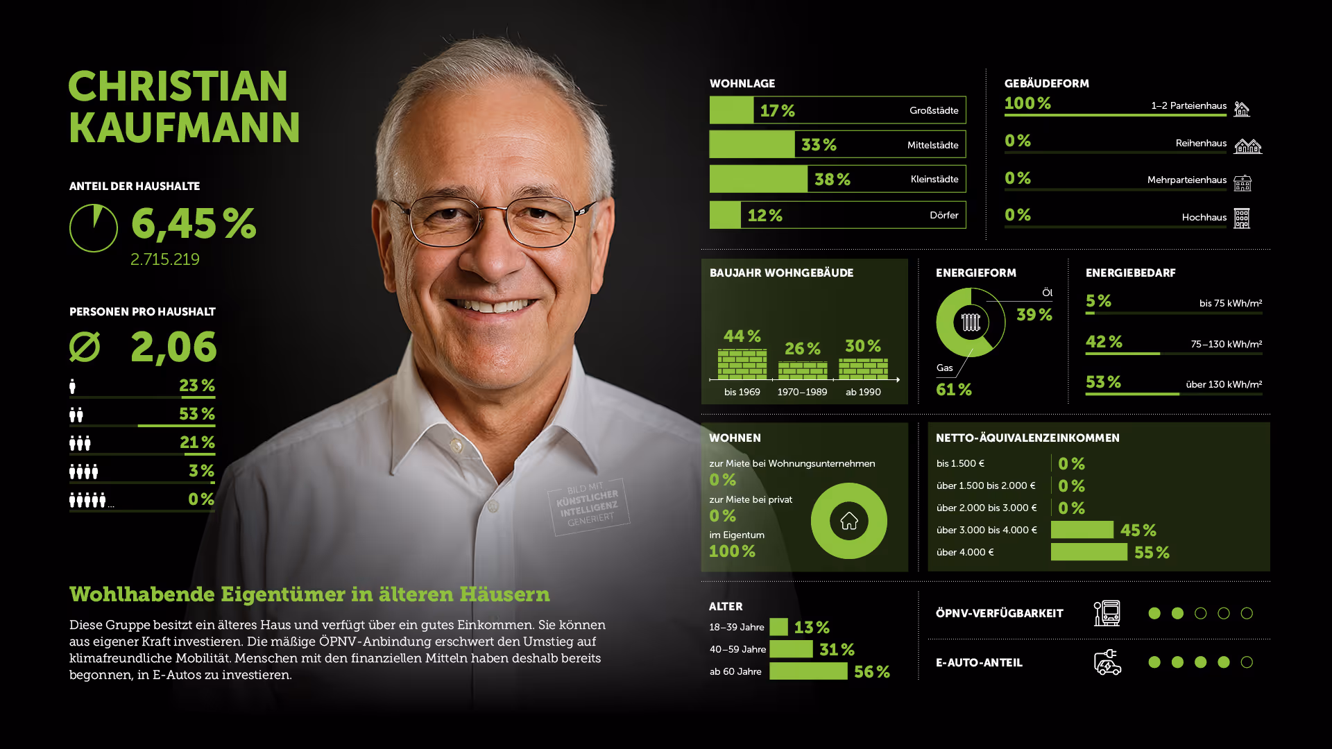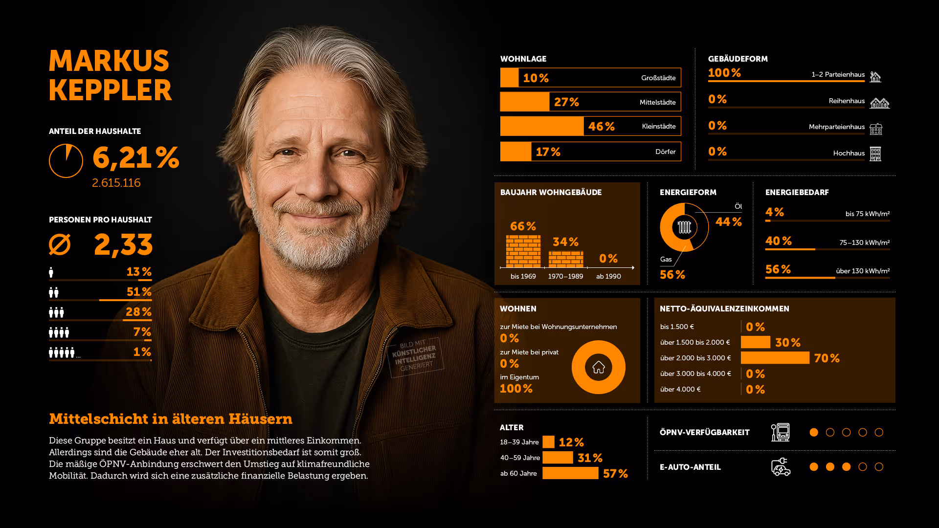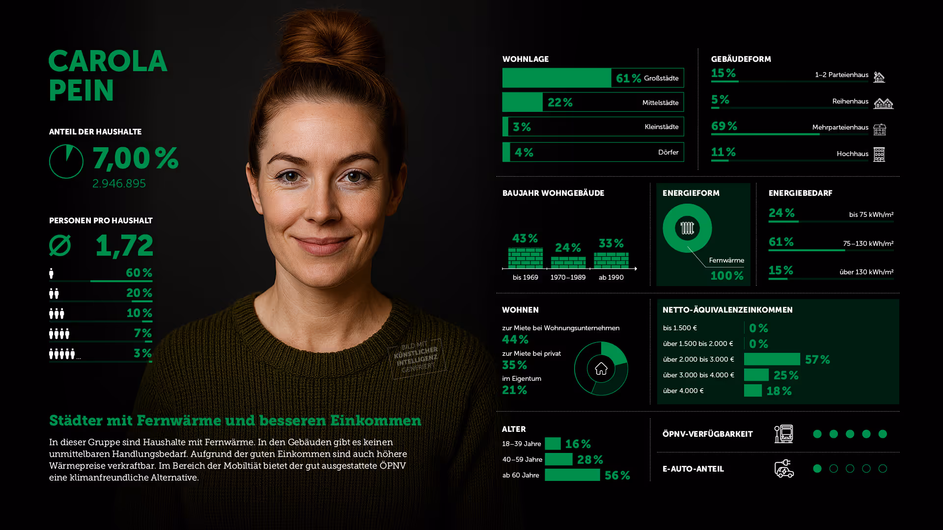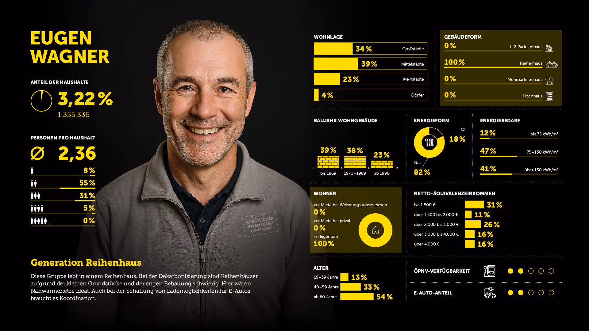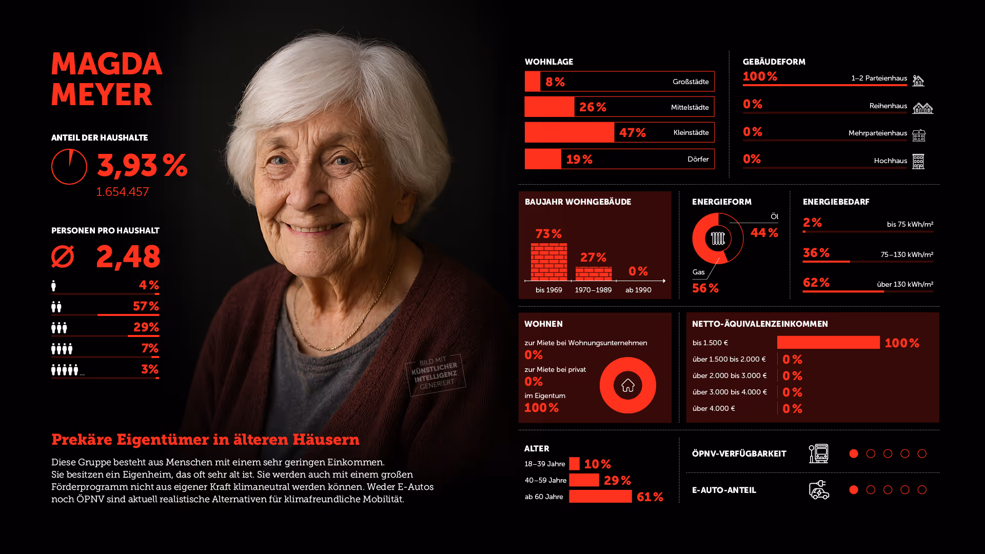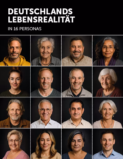 Ein zentraler Baustein: Die gigantischen Datenschätze des Sozial-Klimarats so aufbereiten, dass die unterschiedlichen Lebensrealitäten deutlich werden. 16 Personas zeigen 16 relevante Lebenslagen in Deutschland. Von der prekären Rentnerin ohne ÖPNV-Anschluss bis zur Gutverdienerin im Eigenheim mit E-Auto hat unser Design der Realität ein Gesicht gegeben.